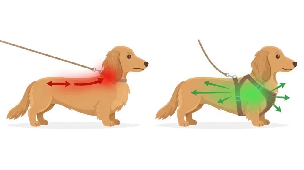 首輪は首に負担が集中しやすく、胴輪(ハーネス)は胸や胴で力を分散しやすいこと、サイズを適切に合わせる重要性が解説されています。