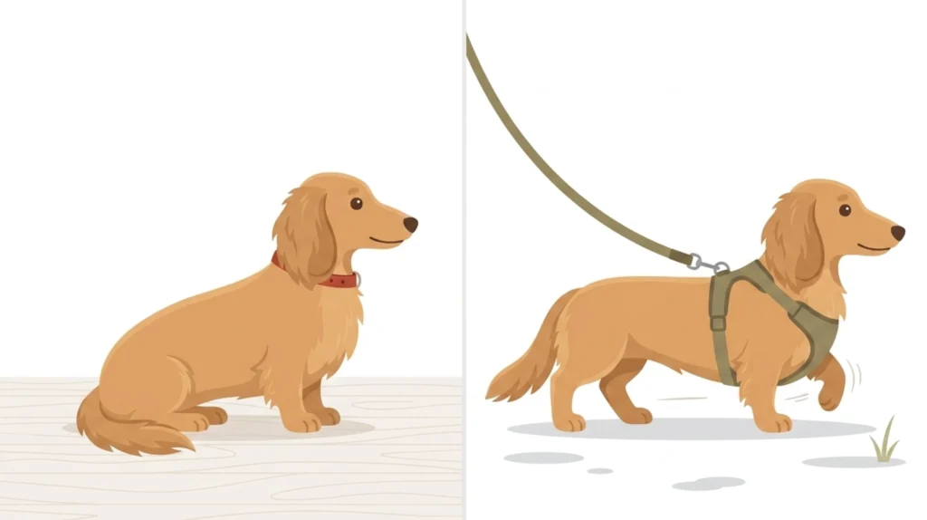 ダックスフンドの散歩では、「首輪でいいのか」「ハーネスの方がいいのか」と迷う方は多いと思います。